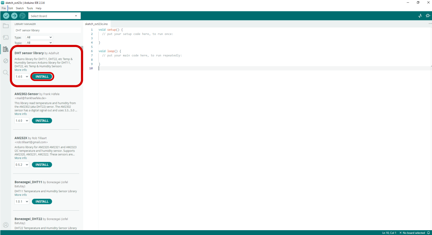 তারপর সার্চবারে “DHT sensor library” লিখে সার্চ দিন এবং DHT sensor library by Adafruit ইন্সটল করে ফেলুন। (ইন্সটলের সময় অবশ্যই Install All অপশনটি সিলেক্ট করবেন যাতে সব ডিপেন্ডেন্সি অটো ইন্সটল হয়।)