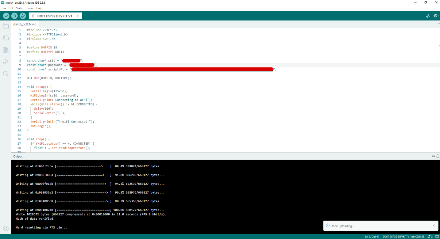 সব ঠিক থাকলে এবার বোর্ড হিসেবে “DOIT ESP32 Devkit V1” এবং সঠিক COM Port সিলেক্ট করে কোডটি আপলোড করতে হবে। আপলোড হয়ে গেলে Done Uploading মেসেজ দেখতে পাবেন।