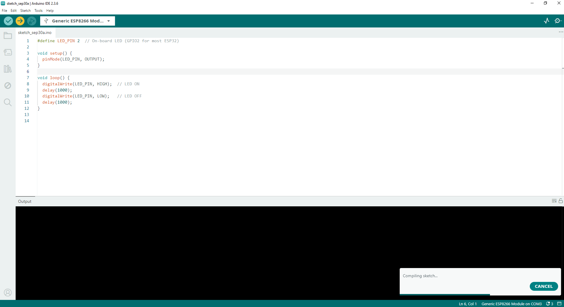 #define LED_PIN 2 // On-board LED (GPIO2 for most ESP32) void setup() { pinMode(LED_PIN, OUTPUT); } void loop() { digitalWrite(LED_PIN, HIGH); // LED ON delay(1000); digitalWrite(LED_PIN, LOW); // LED OFF delay(1000); }