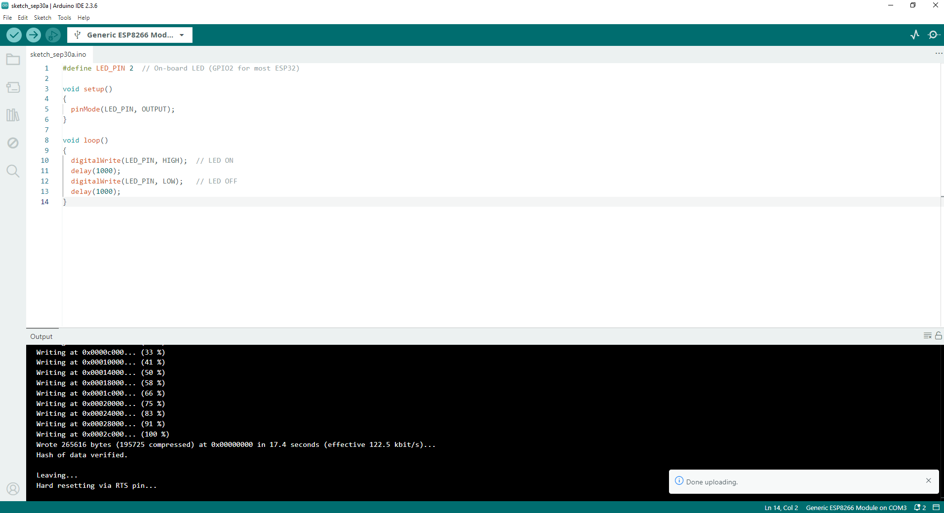 প্রোগ্রামে কোন ধরণের error না থাকলে অর্থাৎ Compiling প্রোসেস সফল ভাবে শেষ হলে, ESP তে প্রোগ্রামটি আপলোড হবে এবং তুমি Done Uploading মেসেজ দেখতে পাবে।
