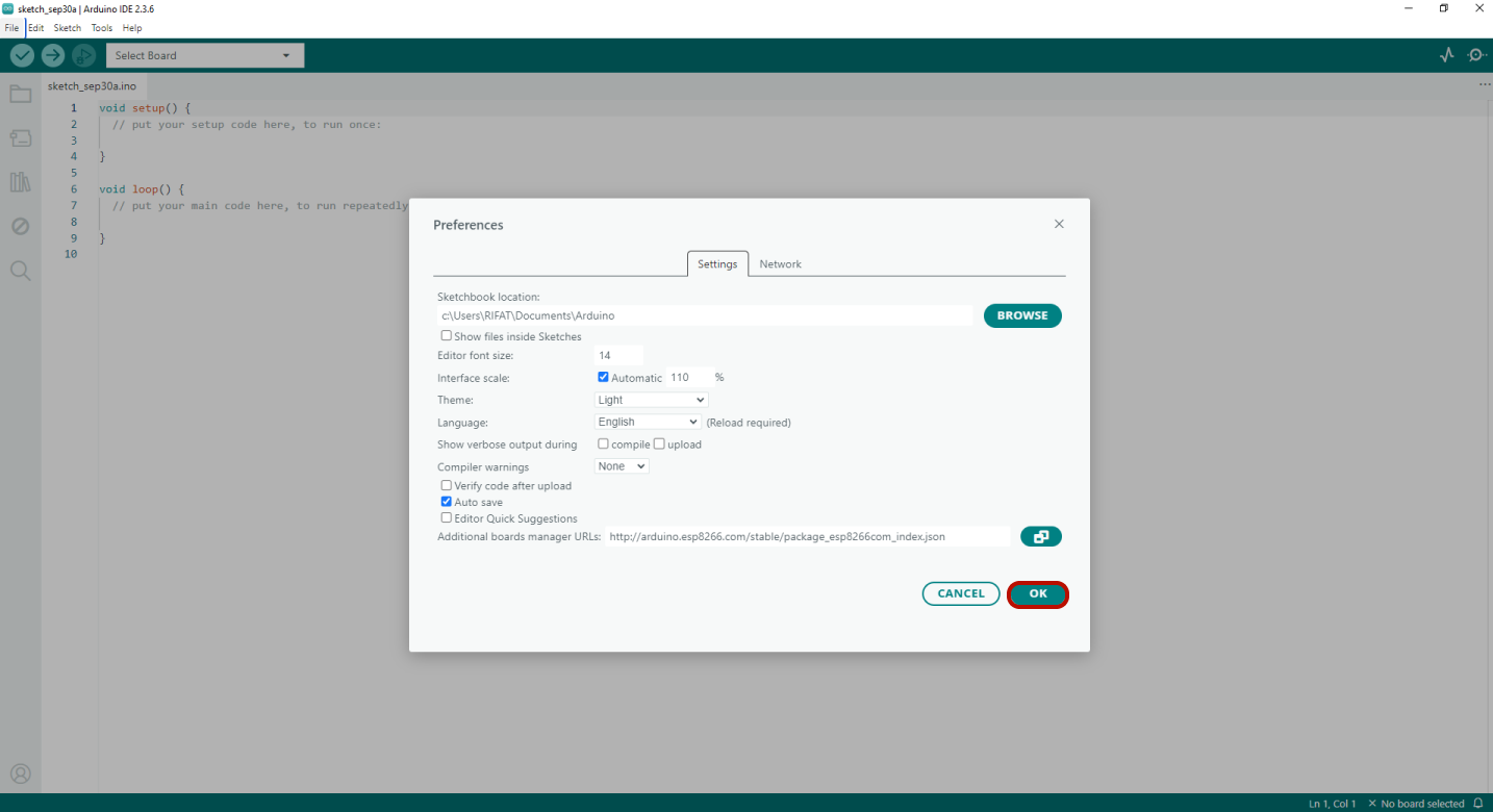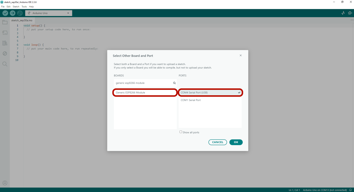 তুমি যে ESP8266 board model ব্যবহার করছো সেটি সিলেক্ট করো, তারপর সঠিক COM port নির্বাচন করো। আমাদের উদাহরণে আমরা Generic ESP8266 Module ব্যবহার করছি। সব ঠিক হয়ে গেলে OK-তে ক্লিক করো।