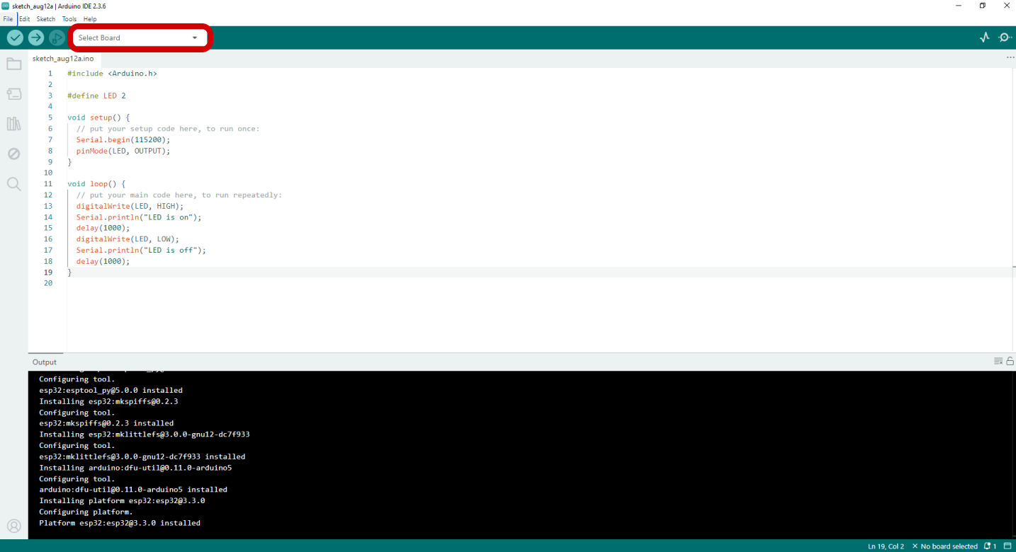Installation প্রোপারলি হয়েছে কিনা বুঝতে চাইলে নিচের সিম্পল Blink LED Code টি Editor Section এ কপি পেস্ট করো।