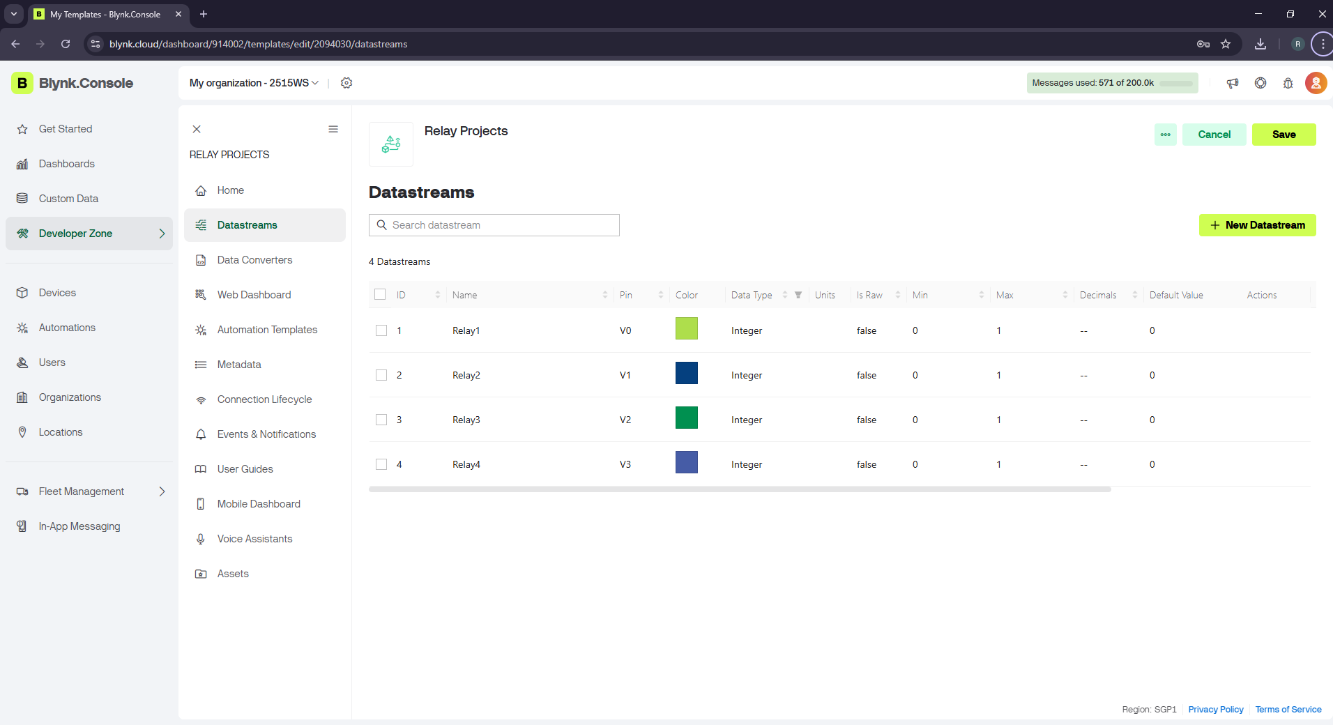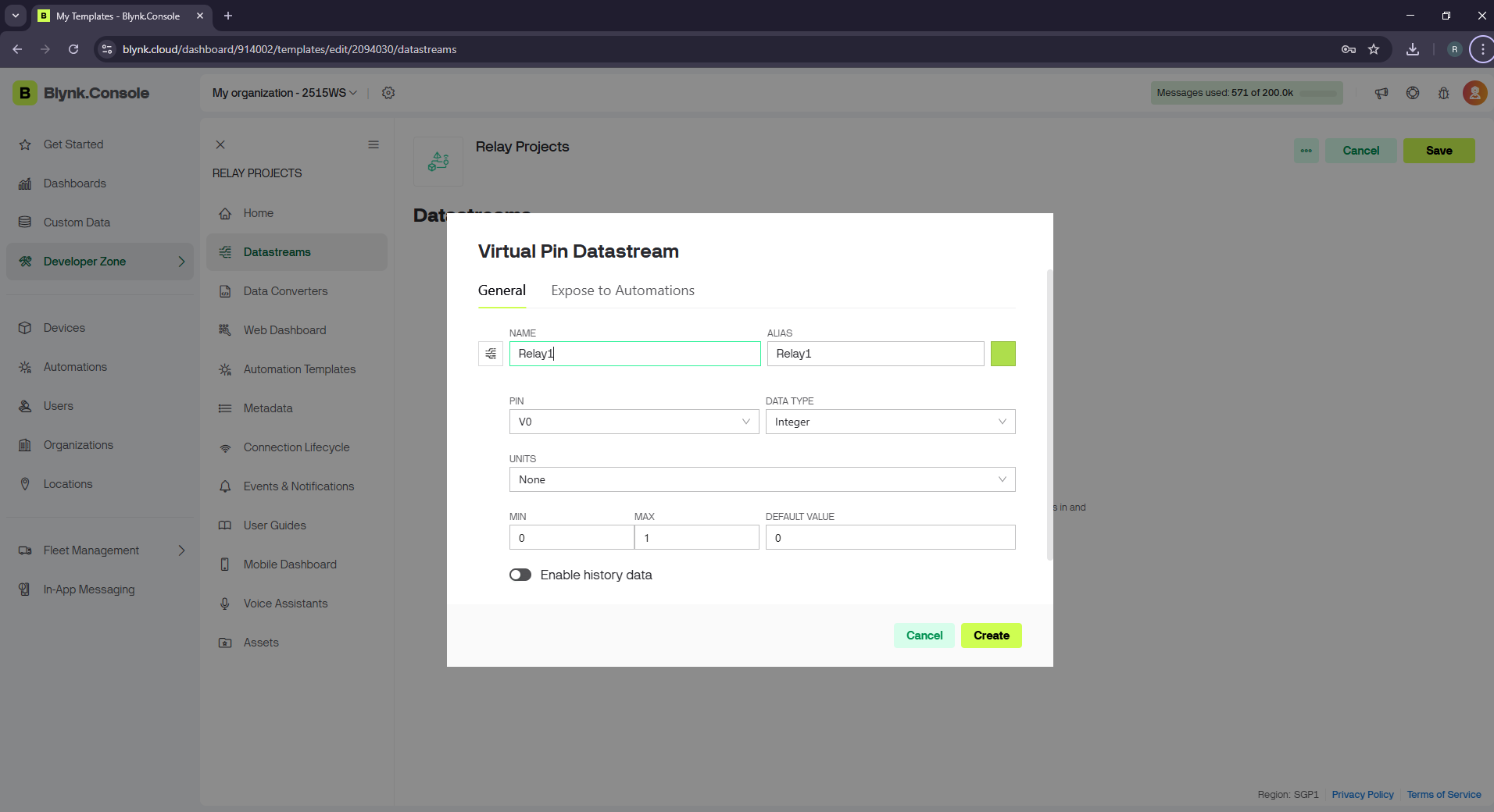 একই প্রক্রিয়ায় Relay2, Relay3, Relay4 এর জন্য যথাক্রমে V1, V2, V3 Virtual Pins ব্যবহার করে আরও তিনটি Datastream তৈরি করুন।
