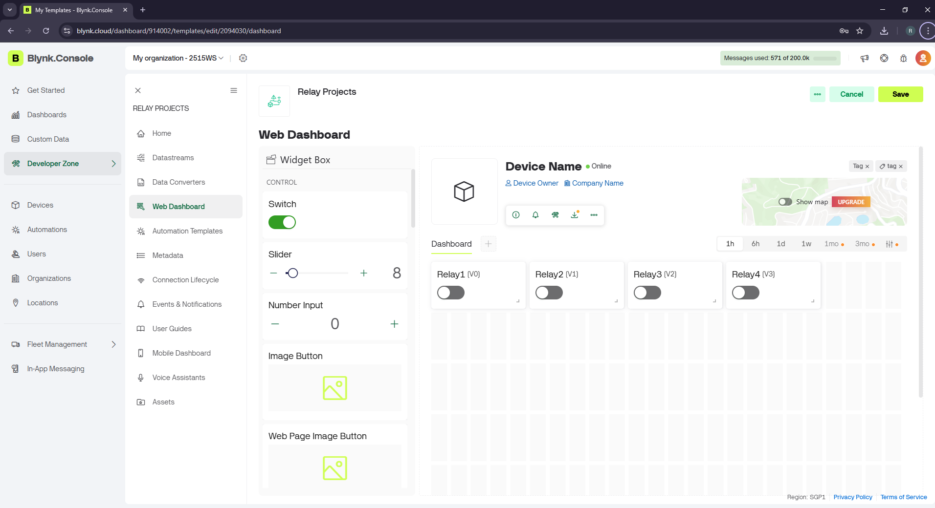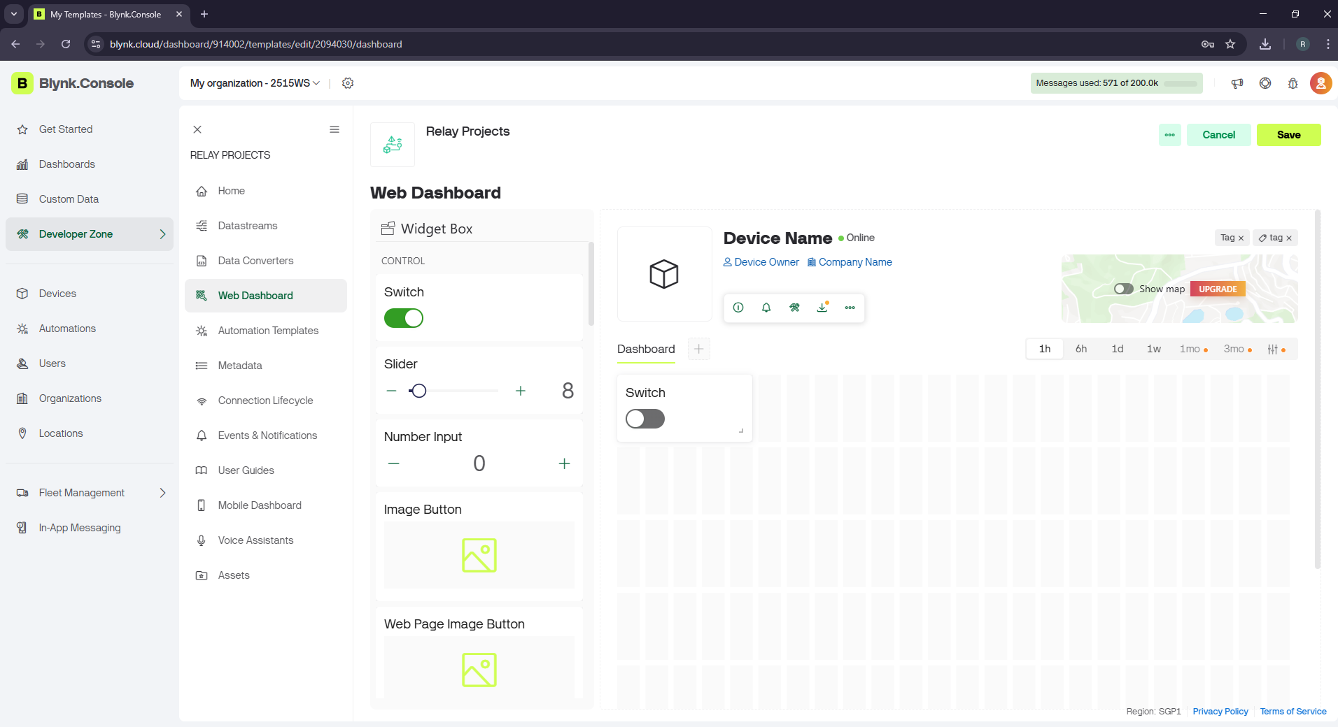 এরপর Relay Project এর Sidebar থেকে Web Dashboard ওপেন করতে হবে এবং Widget Box থেকে একটি Switch ড্র্যাগ করে Dashboard-এ স্থাপন করুন।