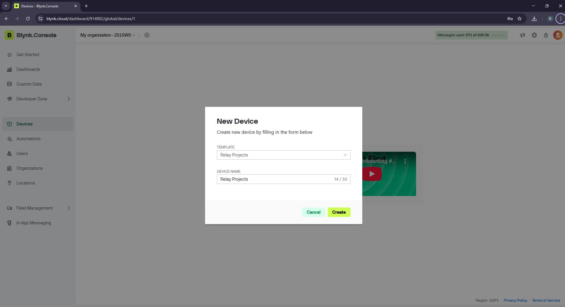 এবার Pop-up Window আসবে। এখানে Name: Relay1, Virtual Pin: V0 এবং ছবির মতো বাকি কনফিগারেশনগুলো ঠিক রেখে Create বাটনে ক্লিক করুন।