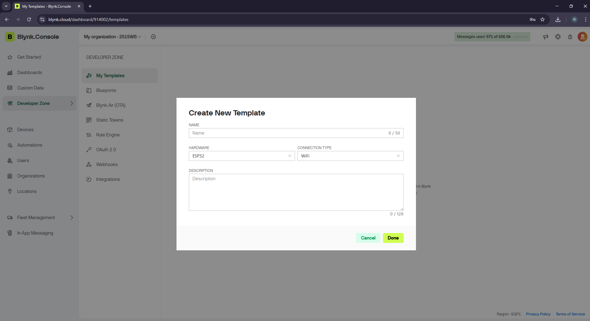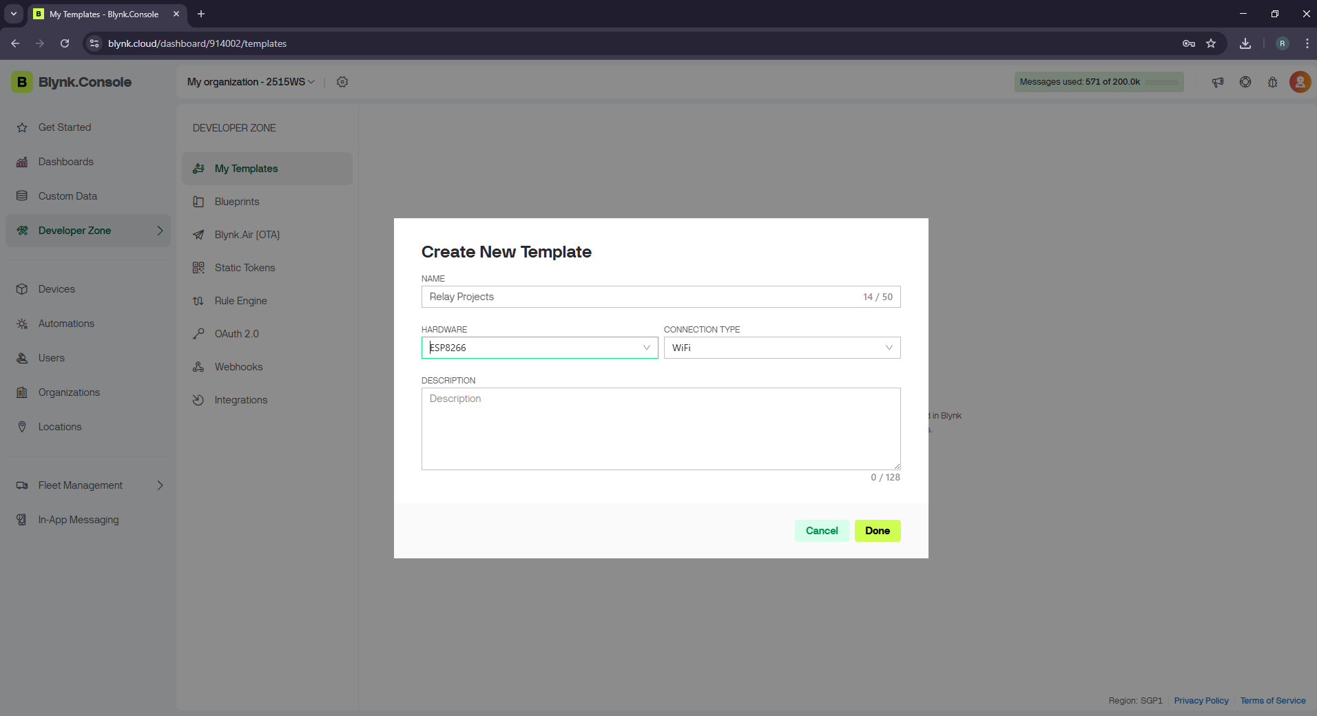 এখানে Name ঘরে Relay Project, Device থেকে ESP8266 এবং Connection Type হিসেবে WiFi সিলেক্ট করে Done প্রেস করুন।