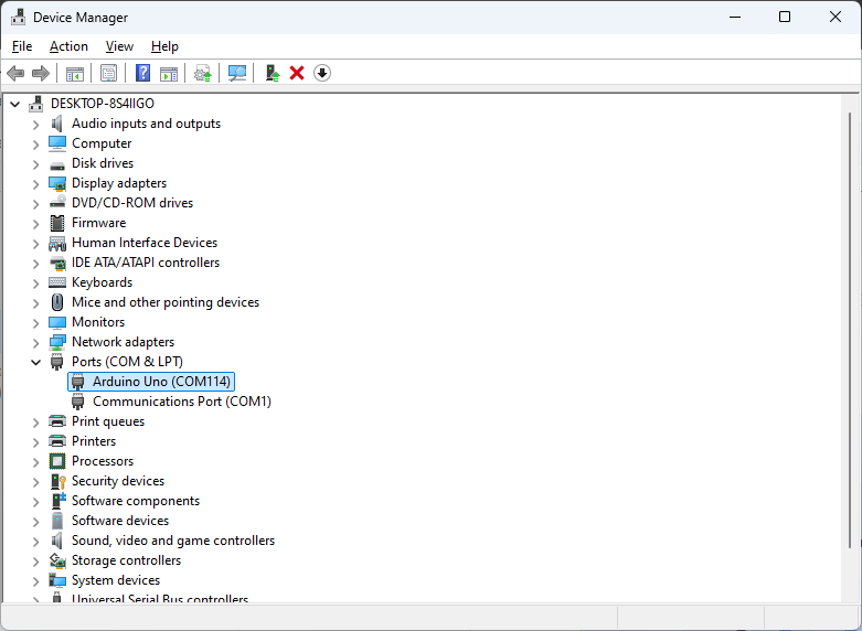 Device Manager উইনডোউটি রিফ্রেশ হবে এবং Arduino UNO নামে নতুন একটি COM Port দেখা যাবে। যেমন আমার এখানে Arduino Uno (COM 114) পোর্টটি ডিটেক্ট হয়েছে। আপনার ক্ষেত্রে তা COM3, COM8, COM10, COM15, COM72… ইত্যাদি যা কিছু হতে পারে।